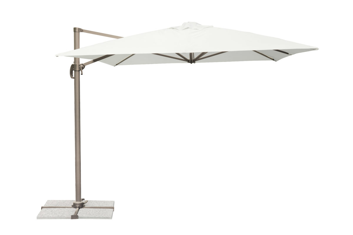 Ombellone 3×4 palo laterale – fusto ovale 77 mm in alluminio color tortora a 8 bacchette – apertura a manovella – con maniglione – poliestere 220 gr ecrù – ruotabile 360° – altezza max con base 2,73 m