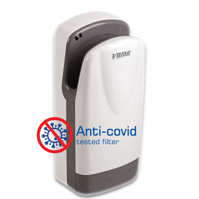 Asciugamani elettrico ECO – JET di nuova generazione, superveloce e ad elevata efficienza energetica, a doppia lama d’aria con inserimento delle mani dall’alto. Vaschetta di raccolta acqua alla base dell’apparecchio e filtro ANTI-COVID in abbinamento.